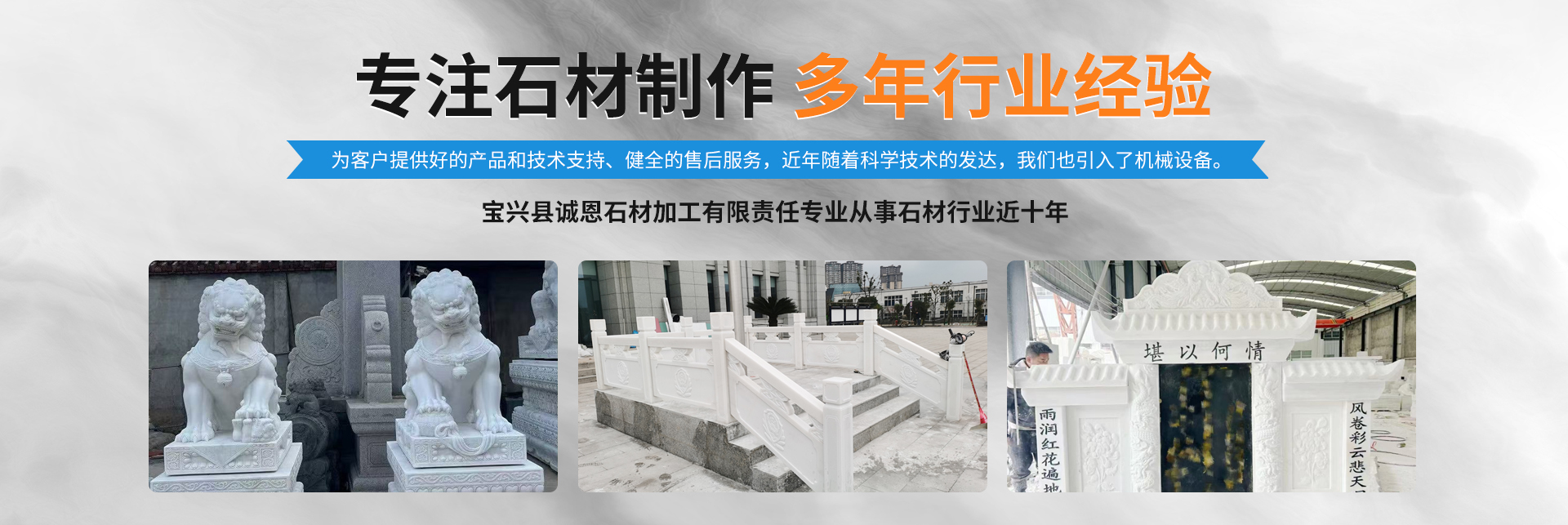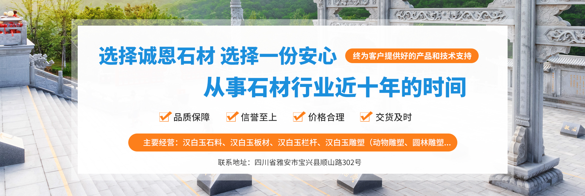 宝兴县诚恩石材加工有限责任公司于2021年成立,坐落于宝兴县灵关汉白玉产业园,厂区占地面积近30亩。虽然公司成立不久,但是我们已经从事石材行业近十年的时间。在工厂发展壮大的时间里,我们始终为客户提供好的产品和技术支持、健全的售后服务,近年随着科学技术的发达,我们也引入了机械设备。我工厂主要经营:汉白玉石料、汉白玉板材、汉白玉栏杆、汉白玉雕塑(动物雕塑、圆林雕塑、城市雕塑、西方人体雕塑)、汉白玉像、汉白玉墓碑、汉白玉石狮、汉白玉花瓶柱;大理石、花岗石荒料购销。